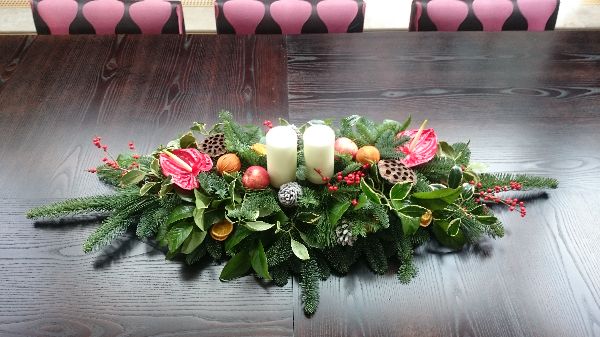 Large festive candle arrangement including ilex berries, red anthuriums as picture